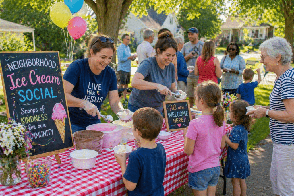 Plan a neighborhood ice cream social and invite nearby families, friends, and community members to stop by. Offer a few ice cream flavors, toppings, and seating areas where people can relax and chat. This is a great summer event that feels fun, welcoming, and low pressure for guests. Sharing dessert together often helps conversations start with ease.