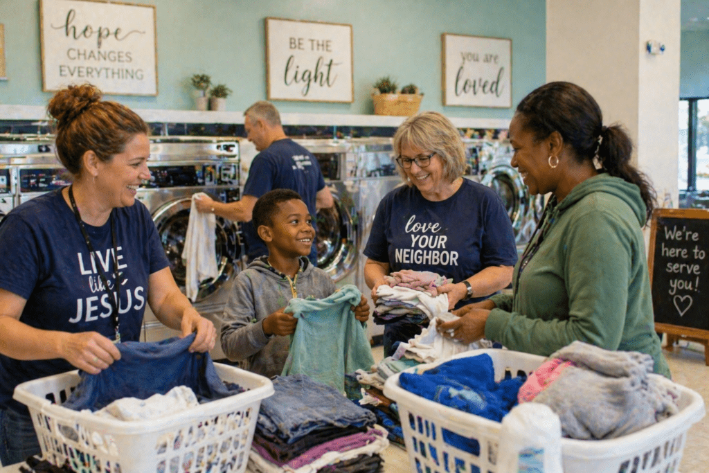 Partner with a local laundromat and help cover laundry costs for families who may need a hand. Church volunteers can provide quarters, prepaid cards, or direct payment depending on the location’s setup. This outreach idea meets an everyday need many people quietly carry. It can also lead to warm conversations and encouragement.