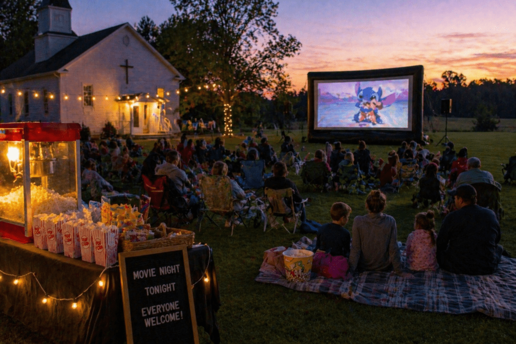 Host an outdoor movie night on church grounds or at a local park and invite the community to attend. Choose a family-friendly film, provide free popcorn, and set up lawn chairs or encourage guests to bring blankets. This is an easy way to create a fun evening that feels open and welcoming. Be sure to promote the event locally so nearby families know they are invited.