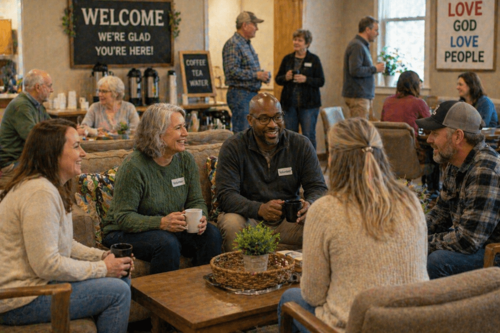 Host a coffee and conversation morning in your fellowship hall and invite the community to stop in. Offer free coffee, pastries, and comfortable seating where people can chat at their own pace. Some guests may come for the coffee and stay for the connection. Warm, low-pressure gatherings can be a great bridge to future involvement.