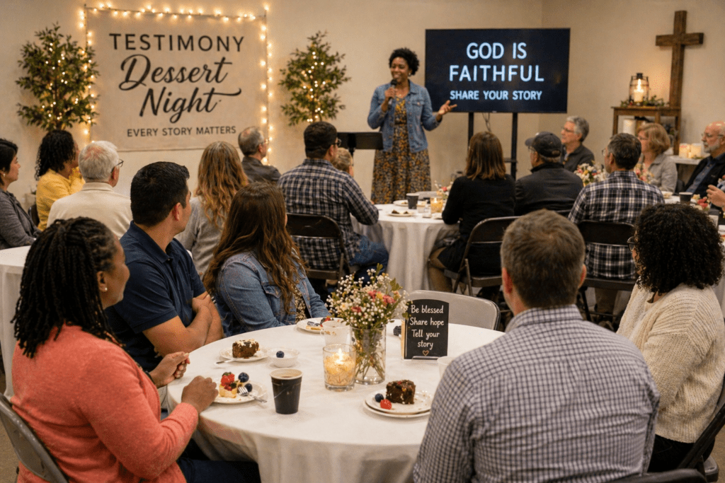 Plan a testimony and dessert night where guests can enjoy sweets while hearing real stories of hope and changed lives. Keep the setting casual and choose speakers who are warm, relatable, and easy to understand. Music or a short devotional can be added if it fits your church style. Even a modest event can create memorable conversations afterward.