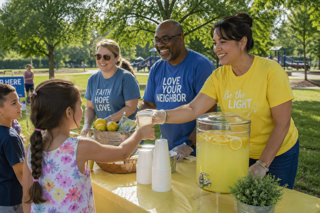 Set up a lemonade stand outside your church, at a local park, or during a community event and offer free cold drinks to anyone passing by. Add a small table with a friendly sign inviting people to share prayer requests if they would like. Let volunteers greet people warmly to create space for natural conversation. Even a short conversation and a cold cup of lemonade can leave a lasting impression.